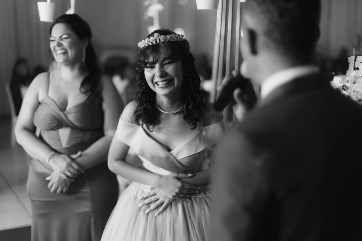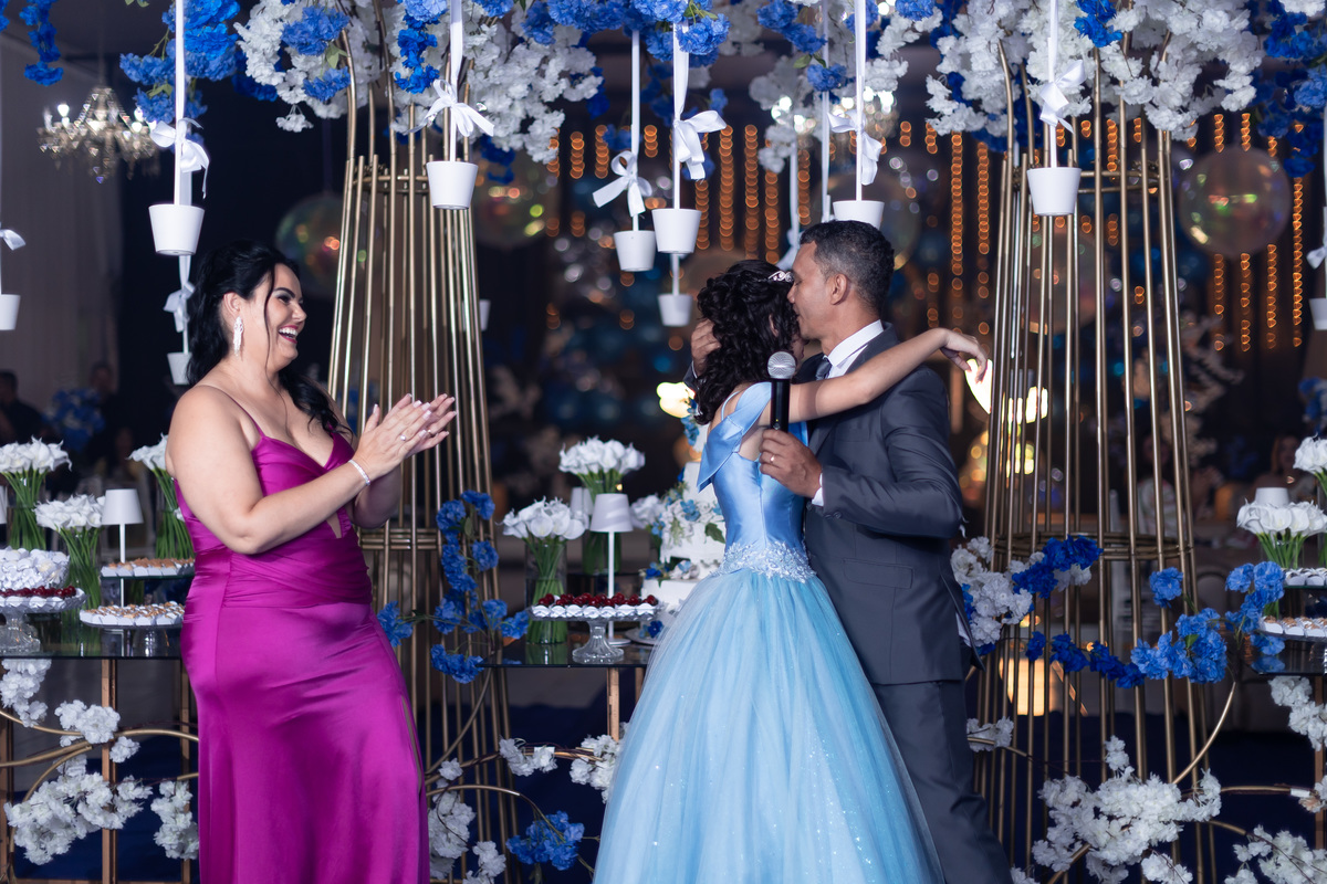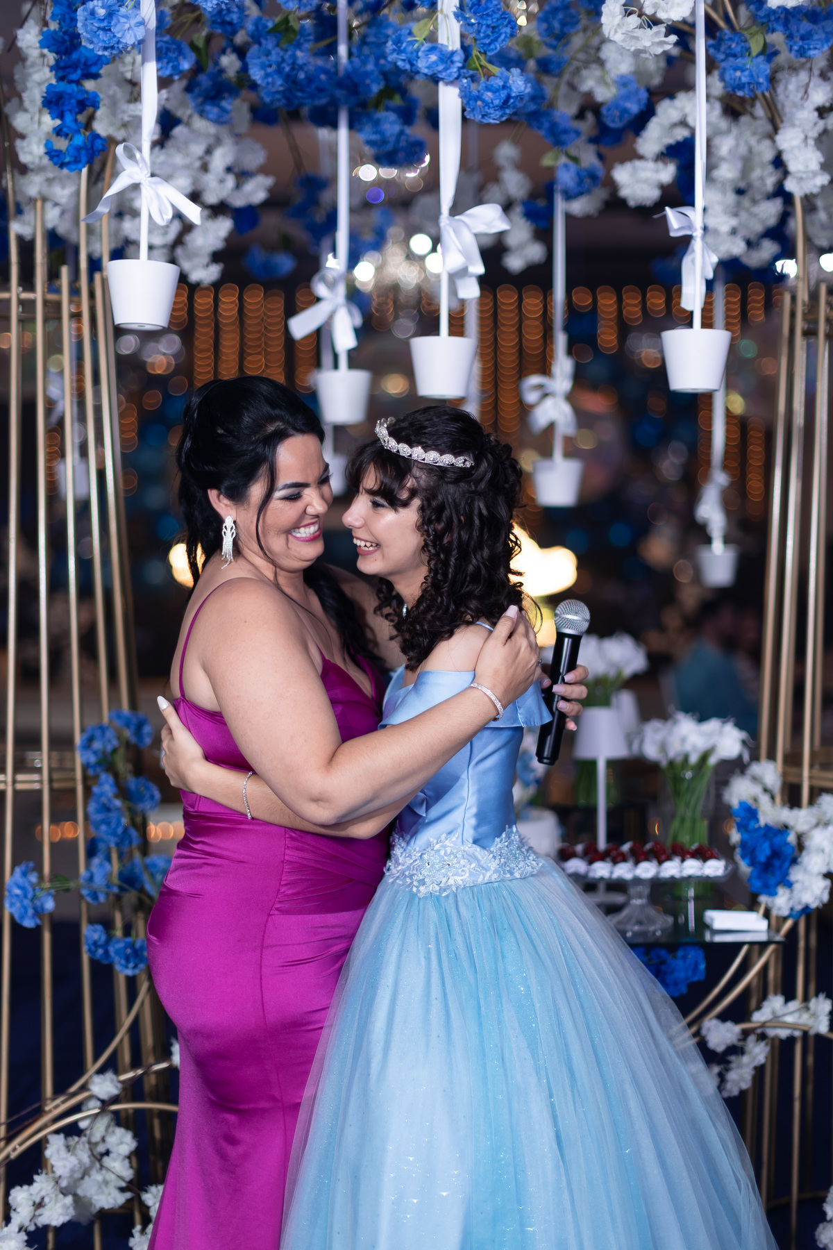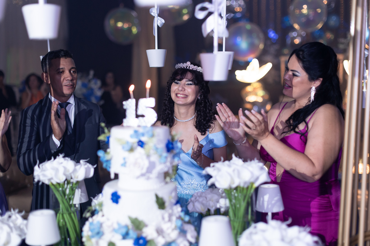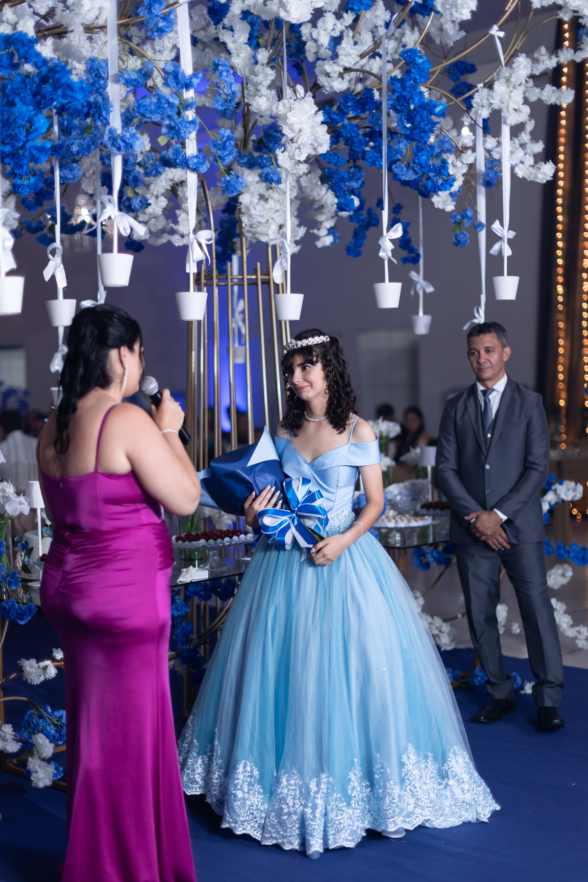 A celebração foi encantadora, rica em detalhes e com um clima acolhedor que envolvia todos os presentes. A família, extremamente amorosa e presente, transformou esse sonho em uma festa de 15 anos inesquecível, marcada por conexão, alegria e significado.